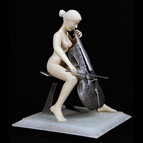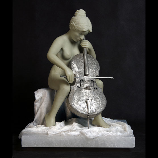 “Woman with Cello” (Var. 1 of 3) , 06 , 31” x 24” x 24” , Cast glass, cast aluminum, steel.
