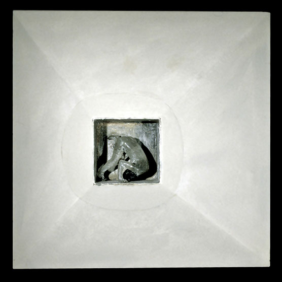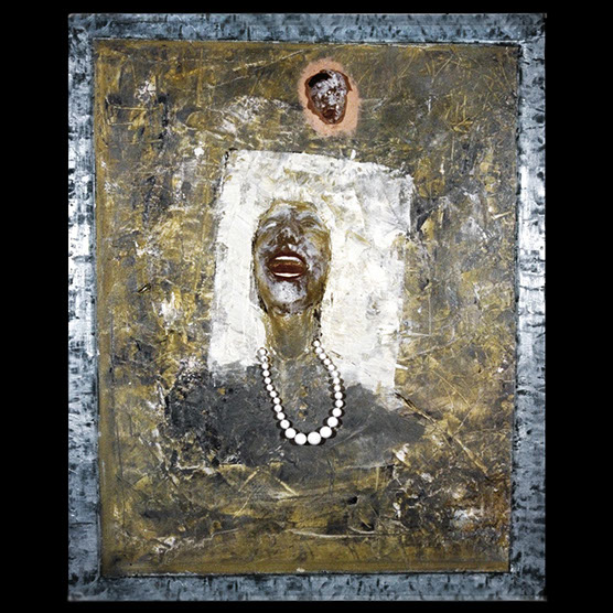 Her Laughter , 87 , 86X71 cm. , Kiln cast glass , wood , oil paint