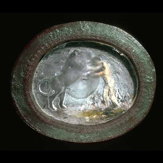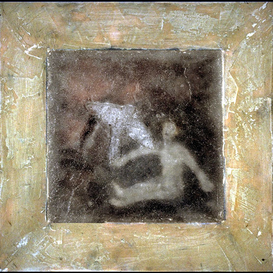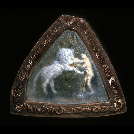 Girl And Dog , 88 , 10.5” x 10.5” , Cast glass, oil paint, in wood frame