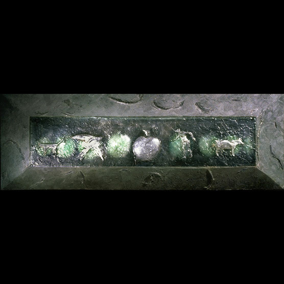 “Silent Balance” , 87 , 39” x 37” , Kiln cast glass, oil paint on wood