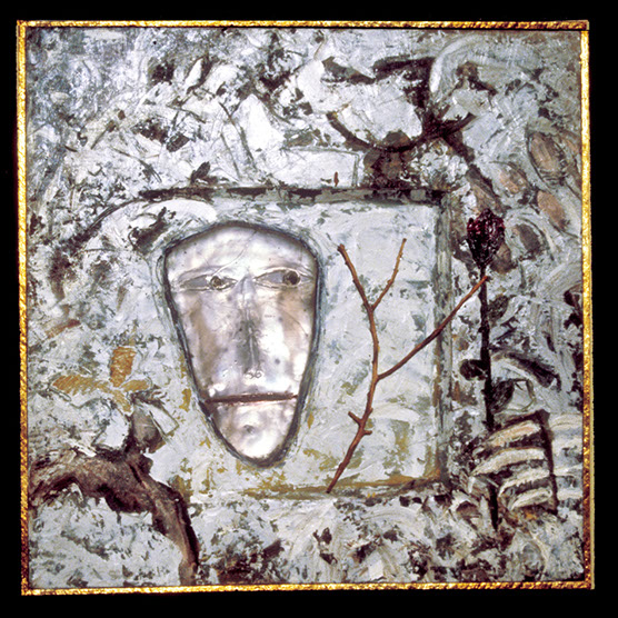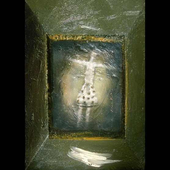 "His Battle" , 89 , 12” x 14": , Kiln cast glass , wood , oil paint