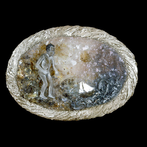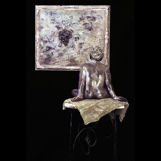 “Waiting Male” , 89 , 13X14X12" , Kiln cast glass , Marble, electroplated dessert rose.