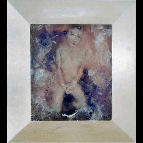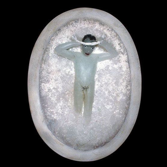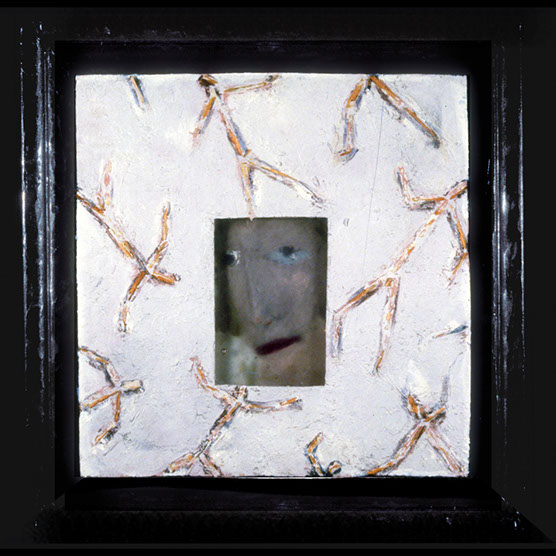 “Innocent” , 92 , 22x20 , Kiln cast glass, wood, oil paint,enamel paint.