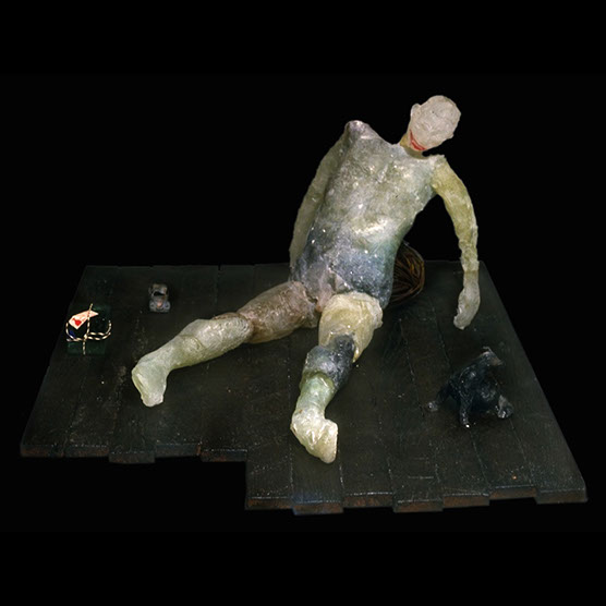 “Magician” , 91 , 32” x 21” x 13.5” , Kiln cast glass, resin coated fabric, oil paint