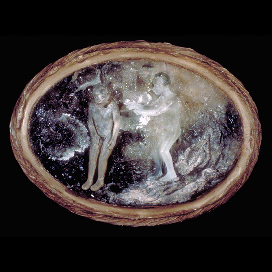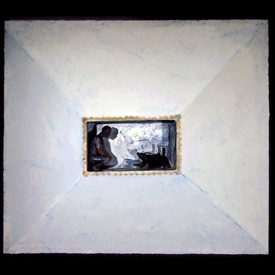 Girl And Dog , 88 , 10.5” x 10.5” , Cast glass, oil paint, in wood frame