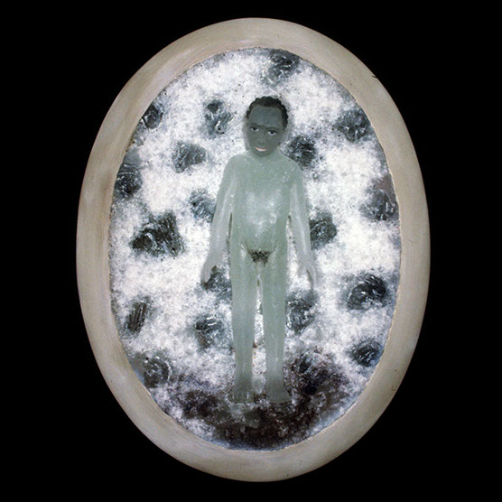 “Innocent” , 92 , 22x20 , Kiln cast glass, wood, oil paint,enamel paint.