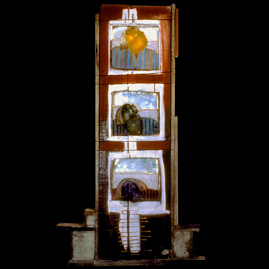 “Remembering” 2 , 92 , 22” x 20” , Kiln cast glass, wood, oil paint, enamel paint.