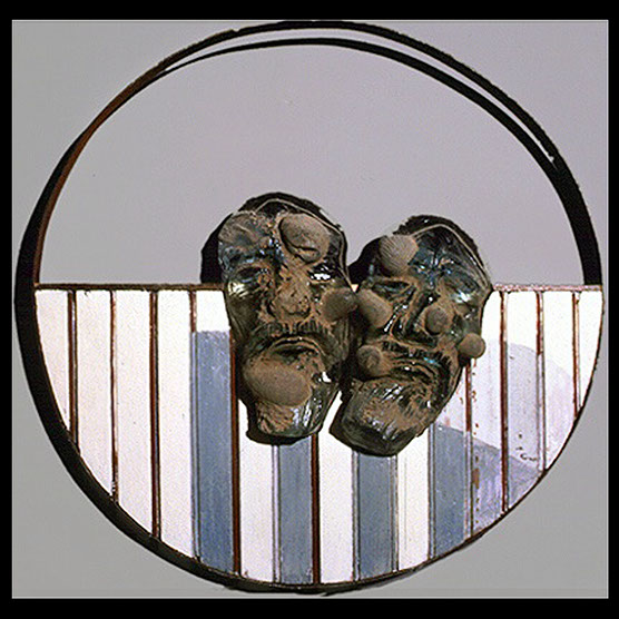 (Father And Son) “Double Portrait” , 92 , 25” x 20” , Kiln cast glass, wood, oil paint, enamel paint